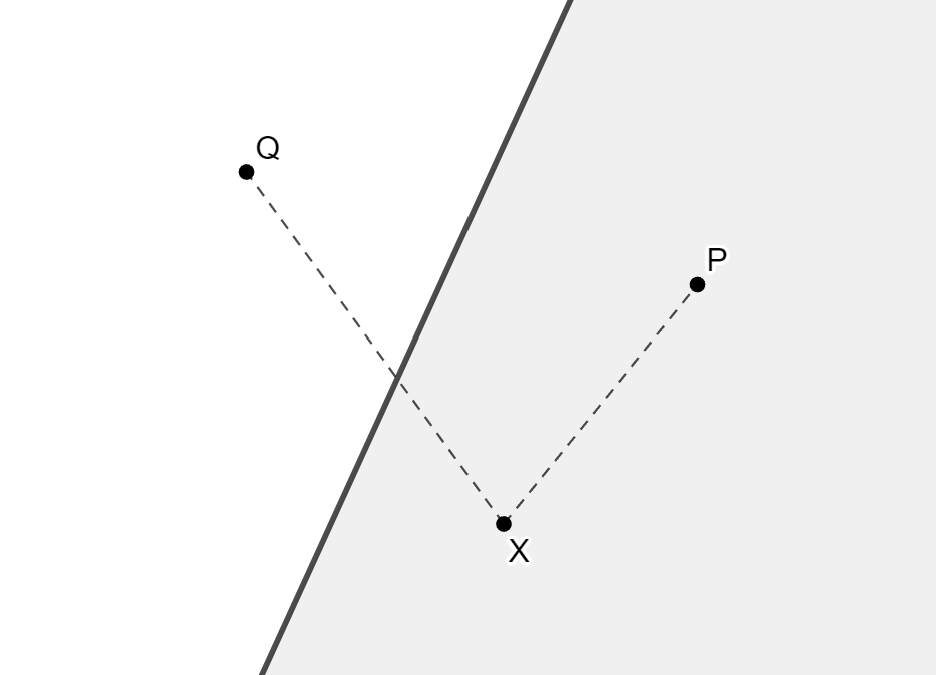- Garantiza que si una recta entra en un triángulo por un lado, debe salir por otro. Esto asegura que los semiplanos son convexos y disjuntos.